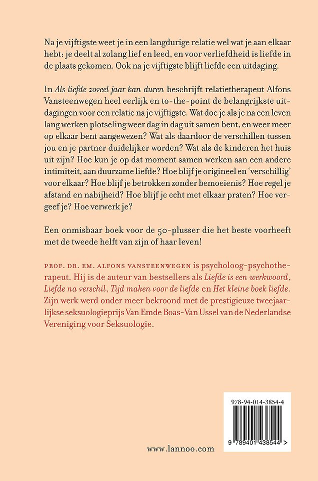Na je vijftigste weet je in een langdurige relatie wel wat je aan elkaar hebt: je deelt al zolang lief en leed, en voor verliefdheid is liefde in de plaats gekomen. Ook na je vijftigste blijft liefde een uitdaging. In Als liefde zoveel jaar kan duren beschrijft relatietherapeut Alfons Vansteenwegen heel eerlijk en to-the-point de belangrijkste uitdagingen voor een relatie na je vijftigste. Wat doe je als je na een leven lang werken plotseling weer dag in dag uit samen bent, en weer meer op elkaar bent aangewezen? Wat als daardoor de verschillen tussen jou en je partner duidelijker worden? Wat als de kinderen het huis uit zijn? Hoe kun je op dat moment samen werken aan een andere intimiteit, aan duurzame liefde? Hoe blijf je origineel en 'verschillig' voor elkaar? Hoe blijf je betrokken zonder bemoeienis? Hoe regel je afstand en nabijheid? Hoe blijf je echt met elkaar praten? Hoe vergeef je? Hoe verwerk je? Een onmisbaar boek voor de 50-plusser die het beste voorheeft met de tweede helft van zijn of haar leven!