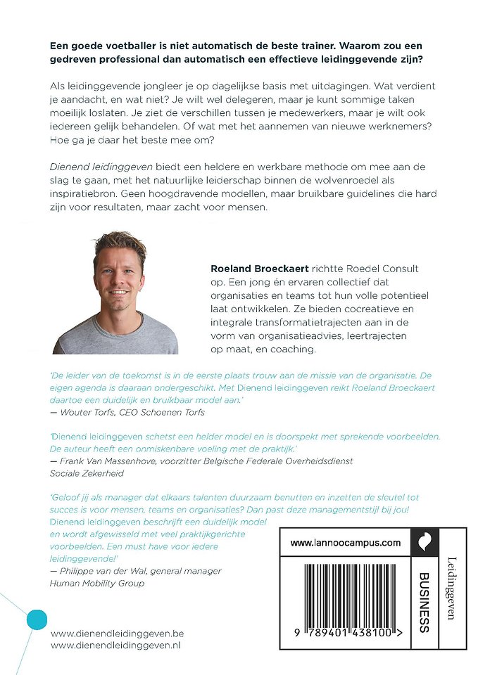 'De leider van de toekomst is in de eerste plaats trouw aan de missie van de organisatie. De eigen agenda is daaraan ondergeschikt. Met Dienend leidinggeven reikt Roeland Broeckaert daartoe een duidelijk en bruikbaar model aan.' - Wouter Torfs, CEO Schoenen Torfs
