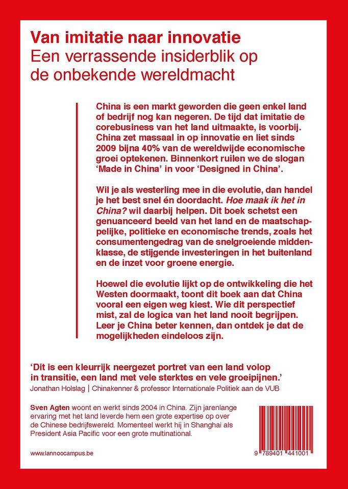 China is een markt geworden die geen enkel land of bedrijf nog kan negeren. De tijd dat imitatie de corebusiness van het land uitmaakte, is voorbij. China zet massaal in op innovatie en liet sinds 2009 bijna 40% van de wereldwijde economische groei optekenen. Binnenkort ruilen we de slogan 'Made in China' in voor 'Designed in China'.