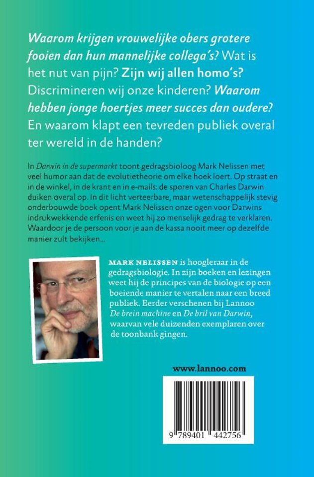Waarom krijgen vrouwelijke obers grotere fooien dan hun mannelijke collega's? Wat is het nut van pijn? Zijn wij allen homo's? Discrimineren wij onze kinderen? Waarom hebben jonge hoertjes meer succes dan oudere? En waarom klapt een tevreden publiek overal ter wereld in de handen? In Darwin in de supermarkt toont gedragsbioloog Mark Nelissen met veel humor aan dat de evolutietheorie om elke hoek loert. Op straat en in de winkel, in de krant en in e-mails: de sporen van Charles Darwin duiken overal op. In dit licht verteerbare, maar wetenschappelijk stevig onderbouwde boek opent Mark Nelissen onze ogen voor Darwins indrukwekkende erfenis en weet hij zo menselijk gedrag te verklaren. Waardoor je de persoon voor je aan de kassa nooit meer op dezelfde manier zult bekijken...