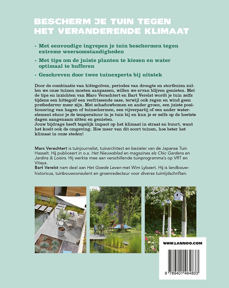 Door de combinatie van hittegolven, periodes van droogte en stortbuien zullen we onze tuinen moeten aanpassen, willen we ervan blijven genieten. Met de tips en inzichten van Marc Verachtert en Bart Verelst wordt je tuin zelfs tijdens een hittegolf een verfrissende oase, terwijl ook regen en wind geen pretbederver meer zijn.