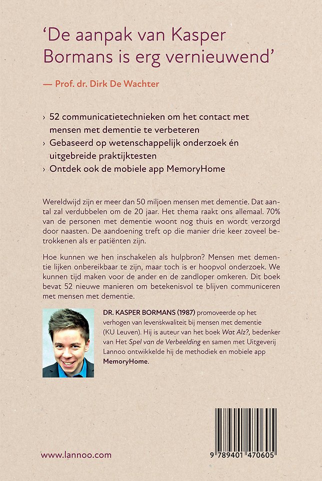 Hoe kunnen we hen inschakelen als hulpbron? Mensen met dementie lijken onbereikbaar te zijn, maar toch is er hoopvol onderzoek. We kunnen tijd maken voor de ander en de zandloper omkeren. Dit boek bevat 52 nieuwe manieren om betekenisvol te blijven communiceren met mensen met dementie.