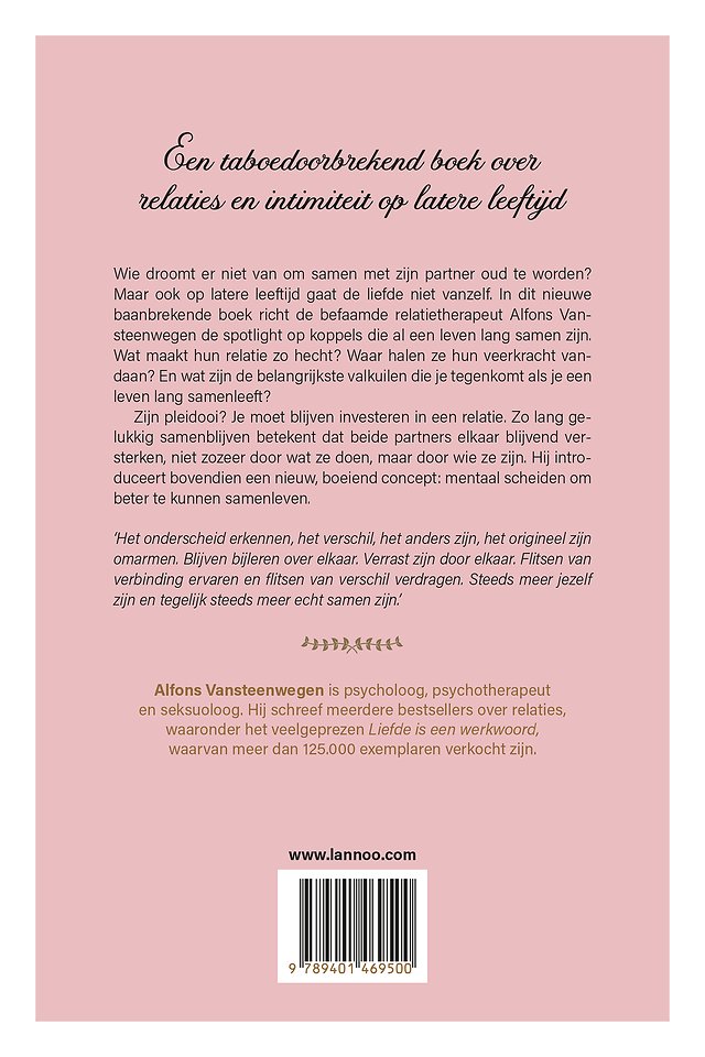 Wie droomt er niet van om samen met zijn partner oud te worden? Maar ook op latere leeftijd gaat de liefde niet vanzelf. In dit nieuwe baanbrekende boek richt de befaamde relatietherapeut Alfons Vansteenwegen de spotlight op koppels die al een leven lang samen zijn. Wat maakt hun relatie zo hecht? Waar halen ze hun veerkracht vandaan? En wat zijn de belangrijkste valkuilen die je tegenkomt als je een leven lang samenleeft? Zijn pleidooi? Je moet blijven investeren in een relatie. Zo lang gelukkig samenblijven betekent dat beide partners elkaar blijvend versterken, niet zozeer door wat ze doen, maar door wie ze zijn. Hij introduceert bovendien een nieuw, boeiend concept: mentaal scheiden om beter te kunnen samenleven.