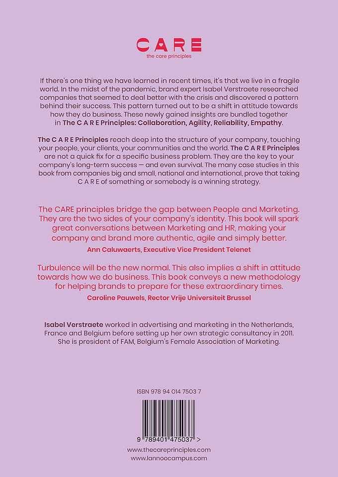 If there's one thing we have learned in recent times, it's that we live in a fragile world. In the midst of the pandemic, brand expert Isabel Verstraete researched companies that seemed to deal better with the crisis and discovered a pattern behind their success. This pattern turned out to be a shift in attitude towards how they do business. These newly gained insights are bundled together in The C A R E Principles: Collaboration, Agility, Reliability, Empathy.