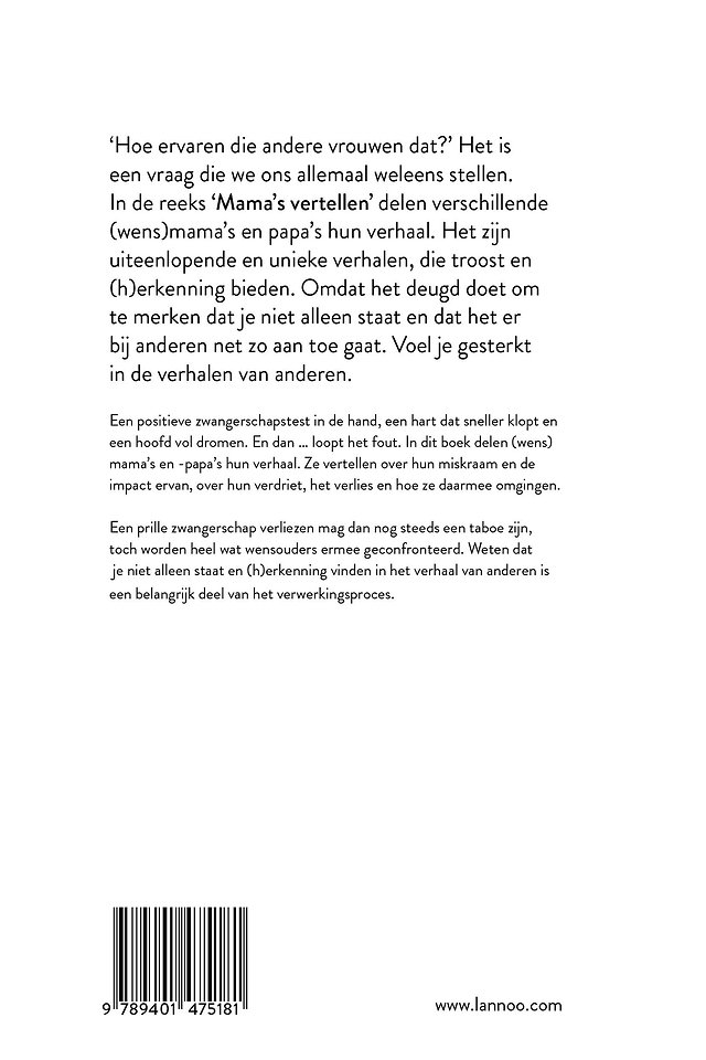 Een positieve zwangerschapstest in de hand, een hart dat sneller klopt en een hoofd vol dromen. En dan... loopt het fout. In deze nieuwe titel in de reeks Mama's vertellen delen (wens) mama's en -papa's hun verhaal. Ze vertellen over hun miskraam en de impact ervan, over hun verdriet en het verlies en hoe ze daarmee omgingen.