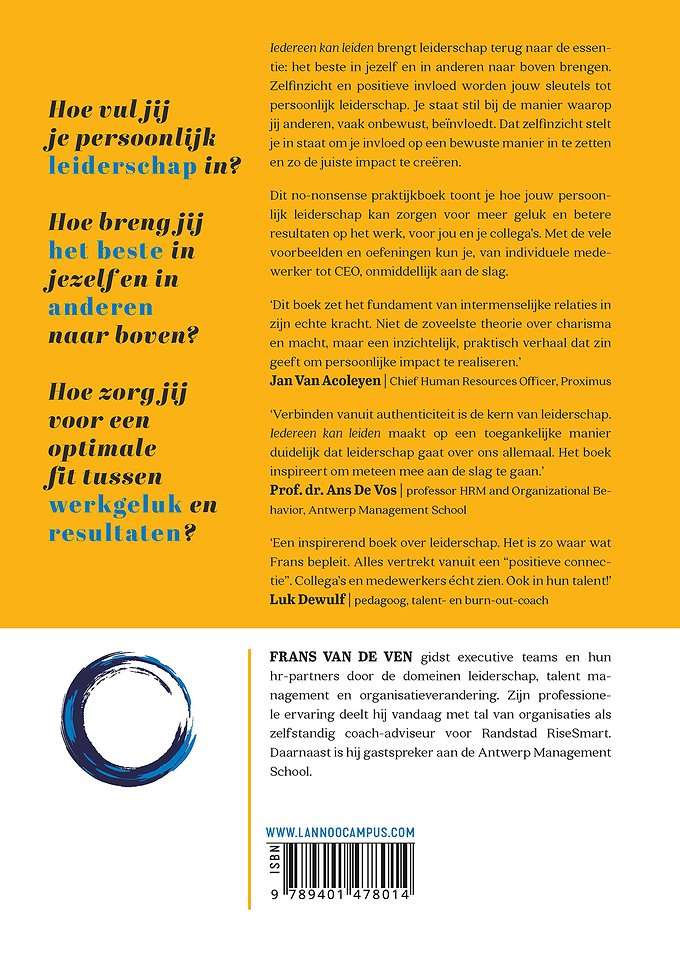 Iedereen kan leiden brengt leiderschap terug naar de essentie: het beste in jezelf en in anderen naar boven brengen. Zelfinzicht en positieve invloed worden jouw sleutels tot persoonlijk leiderschap. Je staat stil bij de manier waarop jij anderen, vaak onbewust, beïnvloedt. Dat zelfinzicht stelt je in staat om je invloed op een bewuste manier in te zetten en zo de juiste impact te creëren.
