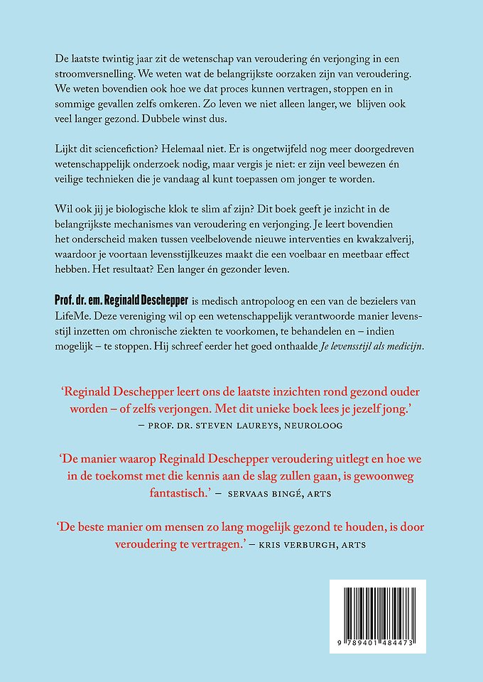 De laatste twintig jaar zit de wetenschap van veroudering én verjonging in een stroomversnelling. We weten wat de belangrijkste oorzaken zijn van veroudering. We weten bovendien ook hoe we dat proces kunnen vertragen, stoppen en in sommige gevallen zelfs omkeren. Zo leven we niet alleen langer, we blijven ook veel langer gezond. Dubbele winst dus.