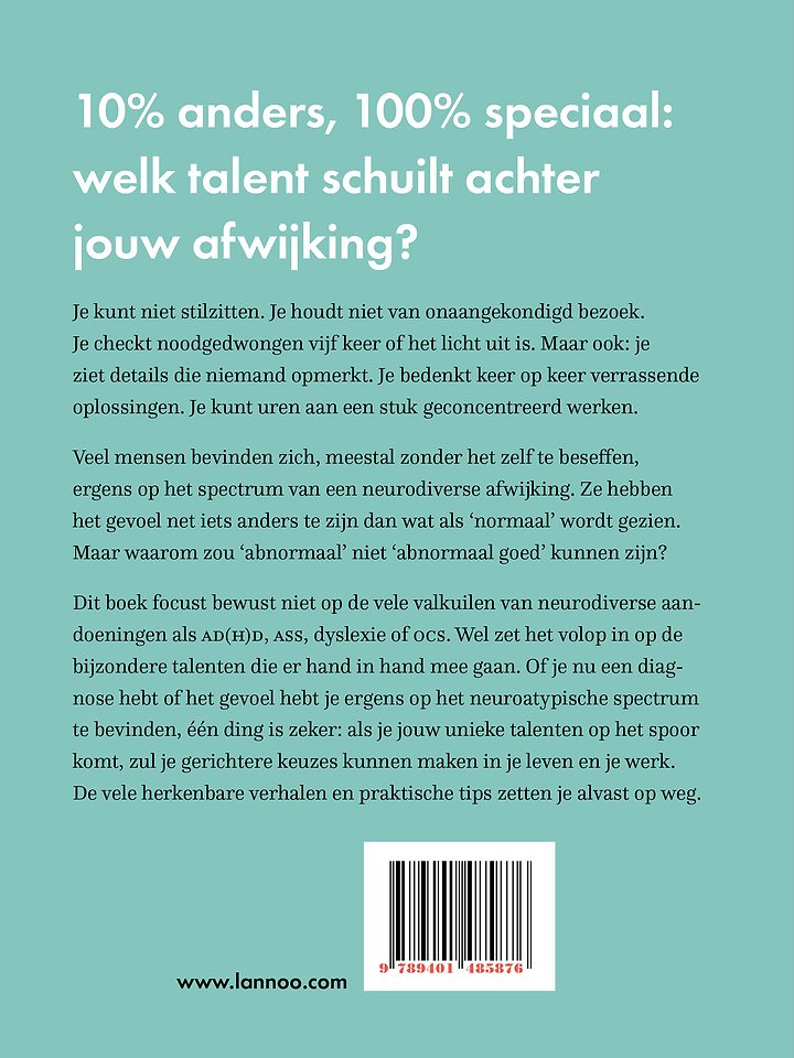 Dit boek focust bewust niet op de vele valkuilen van neurodiverse aandoeningen als ADHD, ASS, dyslexie of OCD. Wel tonen de auteurs dat mensen op het spectrum vaak heel bijzondere talenten hebben. Aan de hand van herkenbare verhalen en praktische tips helpen ze de lezer om hun eigen unieke talenten te ontdekken, om zo gerichtere keuzes te maken in hun leven en werk.