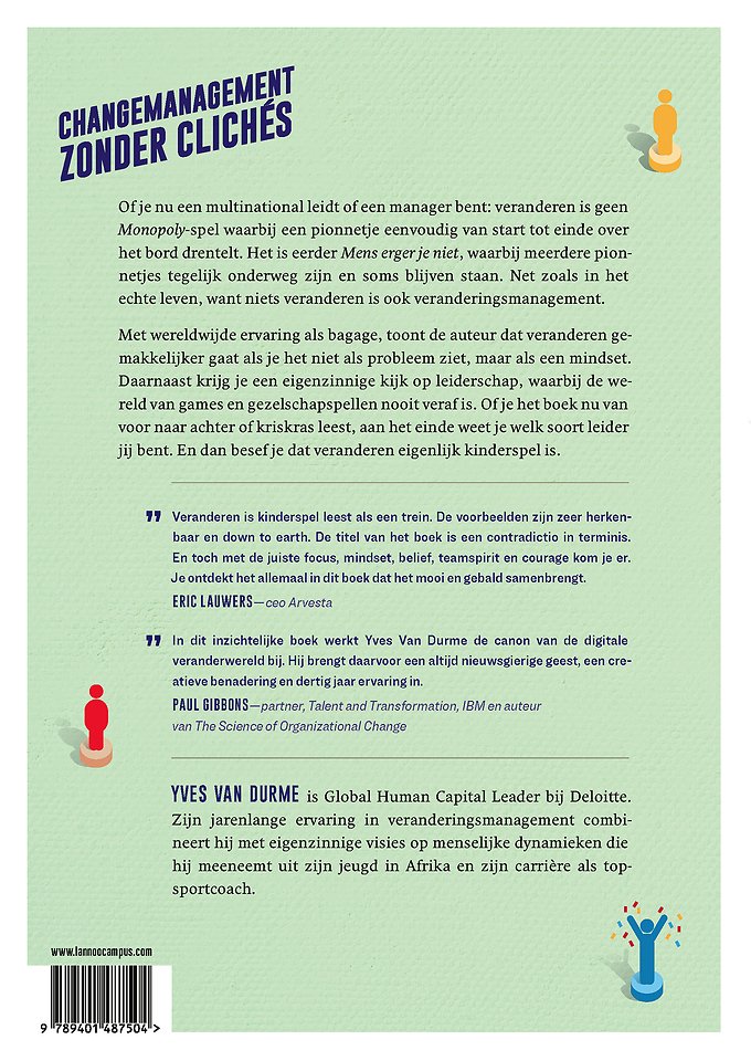 Meer over Yves Van DurmeOf je nu een multinational leidt of een gezin runt: veranderen is geen Monopoly-spel waarbij een pionnetje van start tot einde over het bord drentelt. Het is eerder Mens erger je niet, waarbij meerdere pionnetjes tegelijk onderweg zijn en soms blijven staan. Net zoals in het echte leven, want niets veranderen is ook veranderingsmanagement.
