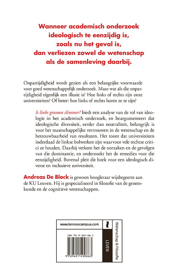 Is links gewoon slimmer? biedt een analyse van de rol van ideologie in het academisch onderzoek, en beargumenteert dat ideologische diversiteit, eerder dan neutraliteit, belangrijk is voor het maatschappelijke vertrouwen in de wetenschap en de betrouwbaarheid van resultaten. Het toont dat universiteiten inderdaad de linkse bolwerken zijn waarvoor vele rechtse critici ze houden. Daarbij verkent het de oorzaken en de gevolgen van die dominantie, en onderzoekt het de remedies voor die eenzijdigheid.