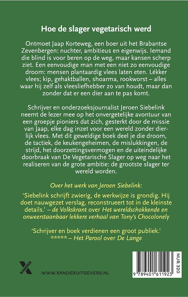 Meer over Jeroen SiebelinkOntmoet Jaap Korteweg, een boer uit het Brabantse Zevenbergen: nuchter, ambitieus en eigenwijs. Iemand die blind is voor beren op de weg, maar kansen scherp ziet. Een eenvoudige man met een niet zo eenvoudige droom: mensen plantaardig vlees laten eten. Lékker vlees; kip, gehaktballen, shoarma, rookworst – alles waar hij zelf als vleesliefhebber zo van houdt, maar dan zonder dat er een dier aan te pas komt.