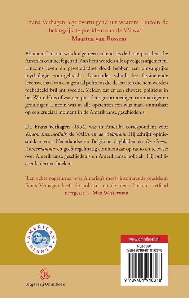 'Frans Verhagen legt overtuigend uit waarom Lincoln de belangrijkste president van de VS was.’ – Maarten van Rossem.