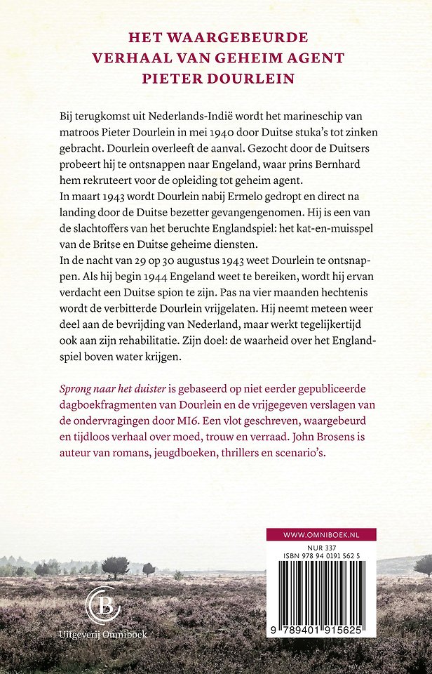 In ‘Sprong naar het duister’ vertelt John Brosens het waargebeurde verhaal van Pieter Dourlein, een Zeeuwse marineman en Engelandvaarder. Matroos Dourlein komt net terug uit Indië in Den Helder als in mei 1940 zijn schip door Duitse stuka’s tot zinken wordt gebracht. Pieter overleeft, vecht met de mariniers en ziet hoe Rotterdam in vlammen opgaat. Gezocht door de Duitsers vlucht hij naar Engeland, waar prins Bernhard hem rekruteert voor de opleiding tot geheim agent. Hij wordt slachtoffer van het Englandspiel, weet te ontsnappen aan de SS, maar wordt bij terugkeer in Engeland niet geloofd door de Britten en gevangengezet. Aan de hand van het dagboek van Dourlein en de archieven van de Britse geheime dienst vertelt John Brosens in ‘Sprong naar het duister’ een spectaculair oorlogsverhaal over een Nederlandse verzetsheld.