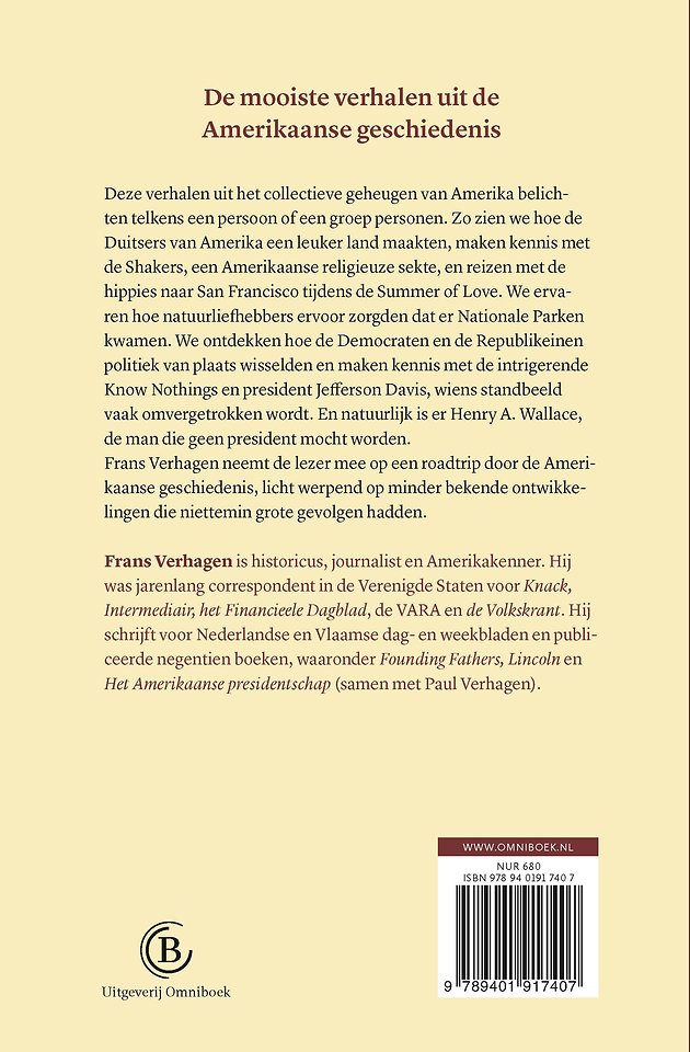 Henry A. Wallace heette hij, en van 1941 tot 1945 was hij vicepresident van de Verenigde Staten van Amerika onder Franklin Delano Roosevelt. Hij was de man die geen president mocht worden en zijn verhaal is een van de verhalen in het nieuwe boek van Frans Verhagen. Samen vertellen die een veel groter verhaal over de fascinerende geschiedenis van de Verenigde Staten. Aan bod komen onder meer de expeditie van Lewis enClark, hoe de Democraten Republikeinen werden en omgekeerd, de intrigerende Know Nothings en het Apenproces. Een belangwekkend kijkje in minder bekende maar bepalende ontwikkelingen in de Amerikaanse geschiedenis.