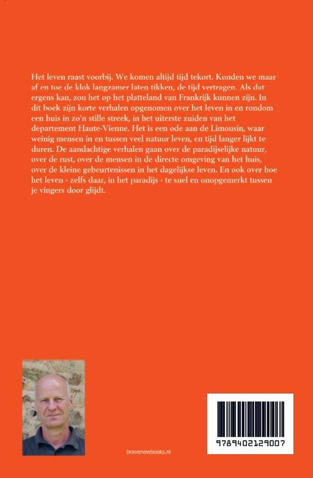 Het leven raast voorbij. We komen altijd tijd tekort. Konden we maar af en toe de klok langzamer laten tikken, de tijd vertragen. Als dat ergens kan, zou het op het platteland van Frankrijk kunnen zijn. In dit boek zijn korte verhalen opgenomen over het leven in en rondom een huis in zo’n stille streek, in het uiterste zuiden van het departement Haute-Vienne. Het is een ode aan de Limousin, waar weinig mensen in en tussen veel natuur leven, en tijd langer lijkt te duren. De aandachtige verhalen gaan over de paradijselijke natuur, over de rust, over de mensen in de directe omgeving van het huis, over de kleine gebeurtenissen in het dagelijkse leven. En ook over hoe het leven - zelfs daar, in het paradijs - te snel en onopgemerkt tussen je vingers door glijdt.