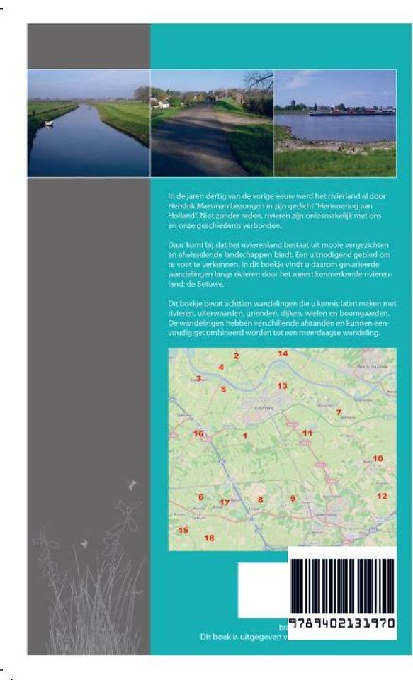 Daar komt bij dat het rivierenland bestaat uit mooie en afwisselende landschappen biedt. Een uitnodigend gebied om te voet te verkennen. In dit boekje vindt u daarom achttien wandelingen langs rivieren door de meest kenmerkende streek de Betuwe.