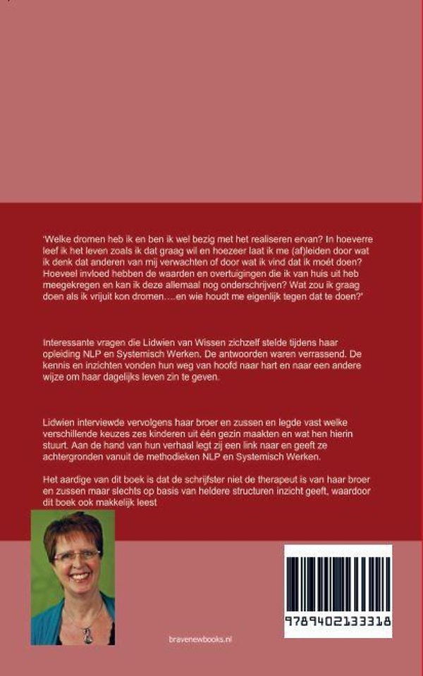 Lidwien interviewde vervolgens haar broer en zussen en legde vast welke verschillende keuzes zes kinderen uit één gezin maakten en wat hen hierin stuurt. Aan de hand van hun verhaal legt zij een link naar en geeft ze achtergronden vanuit de methodieken NLP en Systemisch Werken.