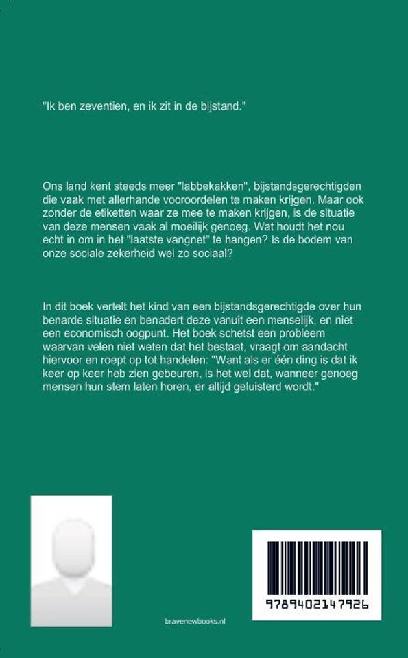"Ik ben zeventien, en ik zit in de bijstand."Ons land kent steeds meer "labbekakken", bijstandsgerechtigden die vaak met allerhande vooroordelen te maken krijgen. Maar ook zonder de etiketten waar ze mee te maken krijgen, is de situatie van deze mensen vaak al moeilijk genoeg. Wat houdt het nou echt in om in het "laatste vangnet" te hangen? Is de bodem van onze sociale zekerheid wel zo sociaal? In dit boek vertelt het kind van een bijstandsgerechtigde over hun benarde situatie en benadert deze vanuit een menselijk, en niet een economisch oogpunt. Het boek schetst een probleem waarvan velen niet weten dat het bestaat, vraagt om aandacht hiervoor en roept op tot handelen: "Want als er één ding is dat ik keer op keer heb zien gebeuren, is het wel dat, wanneer genoeg mensen hun stem laten horen, er altijd geluisterd wordt."