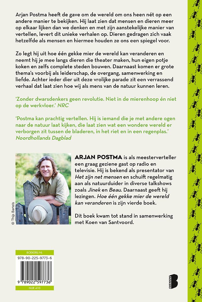 Arjan Postma heeft de gave om de wereld om ons heen nét op een andere manier te bekijken. Hij laat zien dat mensen en dieren meer op elkaar lijken dan we denken en met zijn aanstekelijke manier van vertellen, levert dit unieke verhalen op. Dieren gedragen zich vaak hetzelfde als mensen en hiermee houden ze ons een spiegel voor.