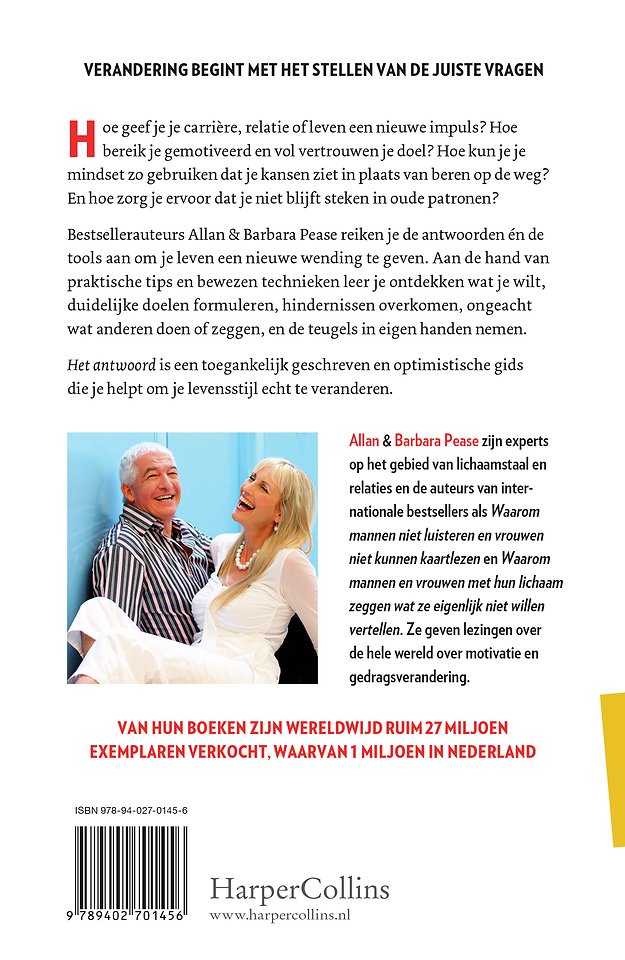 Bestsellerauteurs Allan & Barbara Pease reiken je de antwoorden én de tools aan om je leven een nieuwe wending te geven. Aan de hand van praktische tips en bewezen technieken leer je ontdekken wat je wilt, duidelijke doelen formuleren, hindernissen overkomen, ongeacht wat anderen doen of zeggen, en de teugels in eigen handen nemen. 'Het antwoord' is een toegankelijk geschreven en optimistische gids die je helpt om je levensstijl echt te veranderen.