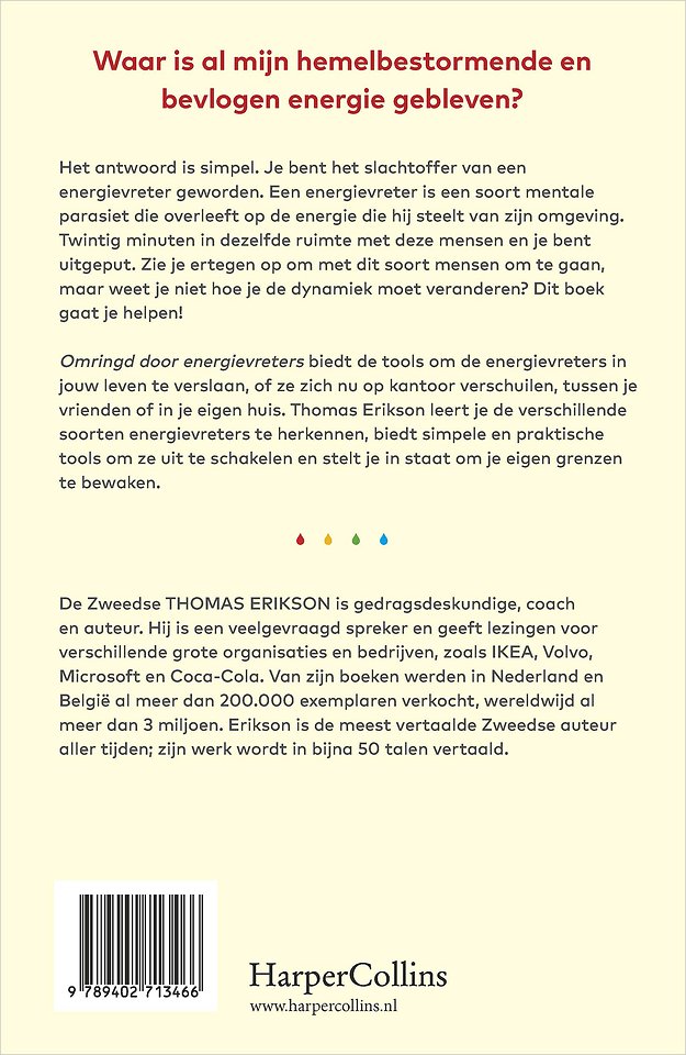 Thomas Erikson biedt simpele en praktische tools om energievreters te identificeren en uit te schakelen. Aan de hand van begrijpelijke modellen, testjes en interessante verhalen zorgt hij ervoor dat je beter in staat bent om je eigen grenzen te bewaken.