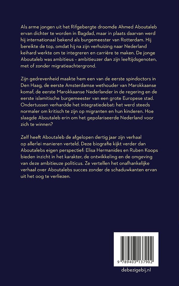 Zelf heeft Aboutaleb de afgelopen dertig jaar zijn verhaal in allerlei delen en varianten verteld. Deze biografie kijkt verder dan Aboutalebs eigen perspectief: Hermanides en Koops bieden inzicht in het karakter, de ontwikkeling en de omgeving van deze ambitieuze man. Hermanides en Koops vertellen het verhaal over Aboutalebs succes zonder de schaduwkanten ervan uit het oog te verliezen.
