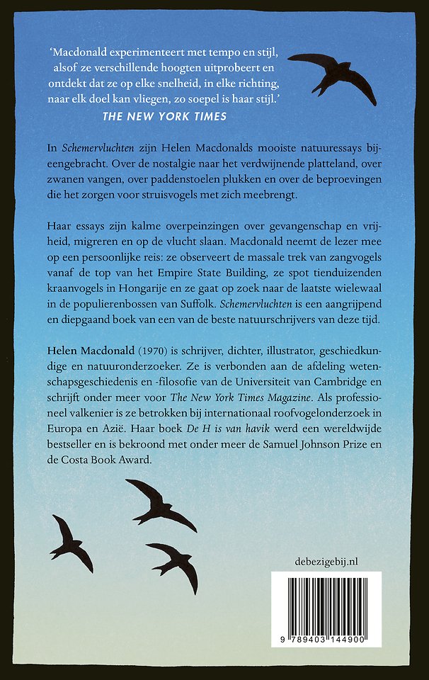 In Schemervluchten zijn Helen Macdonalds mooiste natuuressays bijeengebracht, over onder meer heimwee naar het oude platteland, zwanen vangen, paddenstoelen plukken, knokkende hazen en zonsverduisteringen.