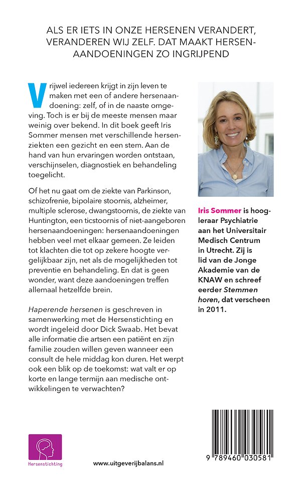 Vrijwel iedereen krijgt in zijn leven te maken met een of andere hersenaandoening: zelf, of in de naaste omgeving. Toch is er bij de meeste mensen maar weinig over bekend. In dit boek geeft Iris Sommer mensen met verschillende aandoeningen een gezicht en een stem. Aan de hand van hun ervaringen worden ontstaan, verschijnselen, diagnostiek en behandeling toegelicht.
