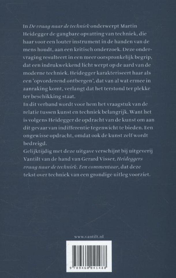 In De vraag naar de techniek onderwerpt Martin Heidegger de gangbare opvatting van techniek, die haar voor een louter instrument in de handen van de mens houdt, aan een kritisch onderzoek. Deze ondervraging resulteert in een meer oorspronkelijk begrip, dat een indrukwekkend licht werpt op de aard van de moderne techniek. Heidegger karakteriseert haar als een 'opvorderend ontbergen', dat van al wat ermee in aanraking komt, verlangt dat het terstond ter plekke ter beschikking staat.
