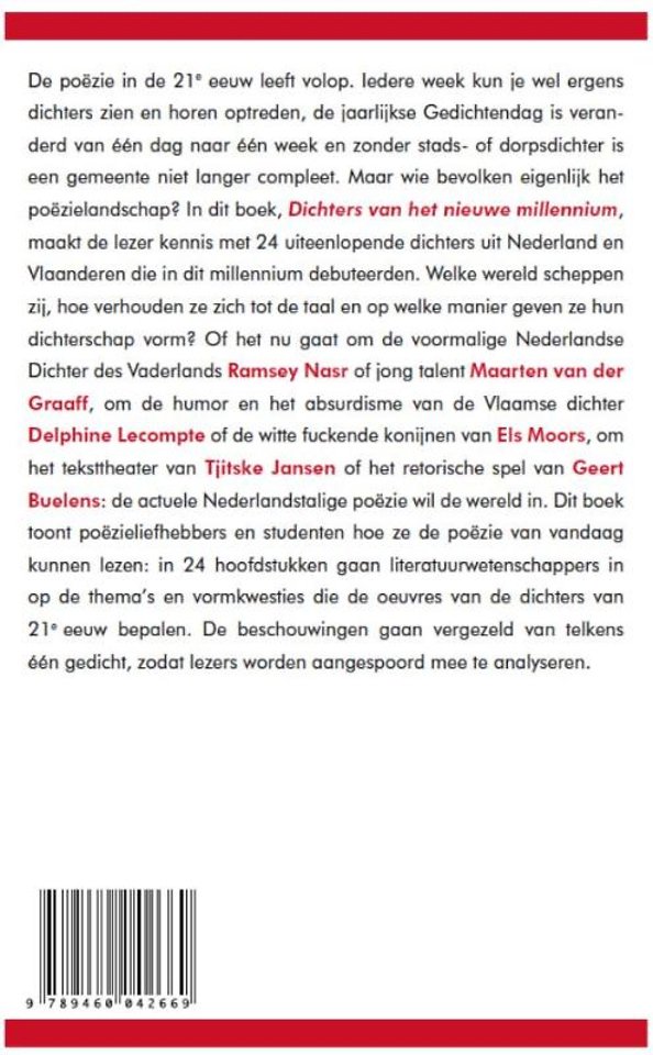De poëzie in de 21e eeuw leeft volop. Iedere week kun je wel ergens dichters zien en horen optreden, de jaarlijkse Gedichtendag is veranderd van één dag naar één week en zonder stads- of dorpsdichter is een gemeente niet langer compleet. Maar wie bevolken eigenlijk het poëzielandschap? In dit boek, Dichters van het nieuwe millennium, maakt de lezer kennis met 24 uiteenlopende dichters uit Nederland en Vlaanderen die in dit millennium debuteerden. Welke wereld scheppen zij, hoe verhouden ze zich tot de taal en op welke manier geven ze hun dichterschap vorm? Of het nu gaat om de voormalige Nederlandse Dichter des Vaderlands Ramsey Nasr of jong talent Maarten van der Graaff, om de humor en het absurdisme van de Vlaamse dichter Delphine Lecompte of de witte fuckende konijnen van Els Moors, om het teksttheater van Tjitske Jansen of het retorische spel van Geert Buelens: de actuele Nederlandstalige poëzie wil de wereld in. Dit boek toont poëzieliefhebbers en studenten hoe ze de poëzie van vandaag kunnen lezen: in 24 hoofdstukken gaan literatuurwetenschappers in op de thema's en vormkwesties die de oeuvres van de dichters van 21e eeuw bepalen. De beschouwingen gaan vergezeld van telkens één gedicht, zodat lezers worden aangespoord mee te analyseren.