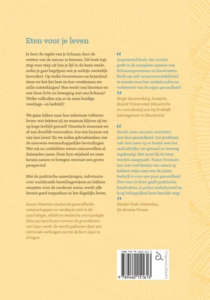 "Steeds meer mensen worstelen met hun gezondheid. Dat probleem valt niet meer op te lossen met het onduidelijke 'eet gezond en beweeg regelmatig'. Het moet bij de bron worden aangepakt. Susan Vroemen laat met veel kennis van zaken op heldere wijze zien wat de juiste leefstijl is voor een pure gezondheid. Eten voor je leven geeft praktische handvatten, is prima onderbouwd en (nog belangrijker) leest heerlijk weg!"