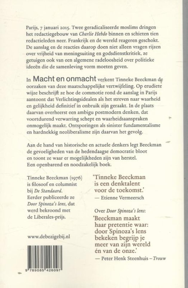 In Macht en onmacht verkent Tinneke Beeckman de oorzaken van deze maatschappelijke vertwijfeling. Op erudiete wijze beschrijft ze hoe de commotie rond de aanslag in Parijs aantoont dat Verlichtingsidealen als het streven naar waarheid en gelijkheid definitief in onbruik zijn geraakt. In de plaats daarvan overheerst een ambigu postmodern denken, dat voortdurend verwarring schept en waarheidsaanspraken onmogelijk maakt. Ontsporingen als sinister fundamentalisme en hardnekkig neoliberalisme zijn daarvan het gevolg. Aan de hand van historische en actuele denkers legt Beeckman de gevoeligheden van de hedendaagse democratie bloot en toont ze waar er mogelijkheden zijn van herstel. Een openbarend en noodzakelijk boek.