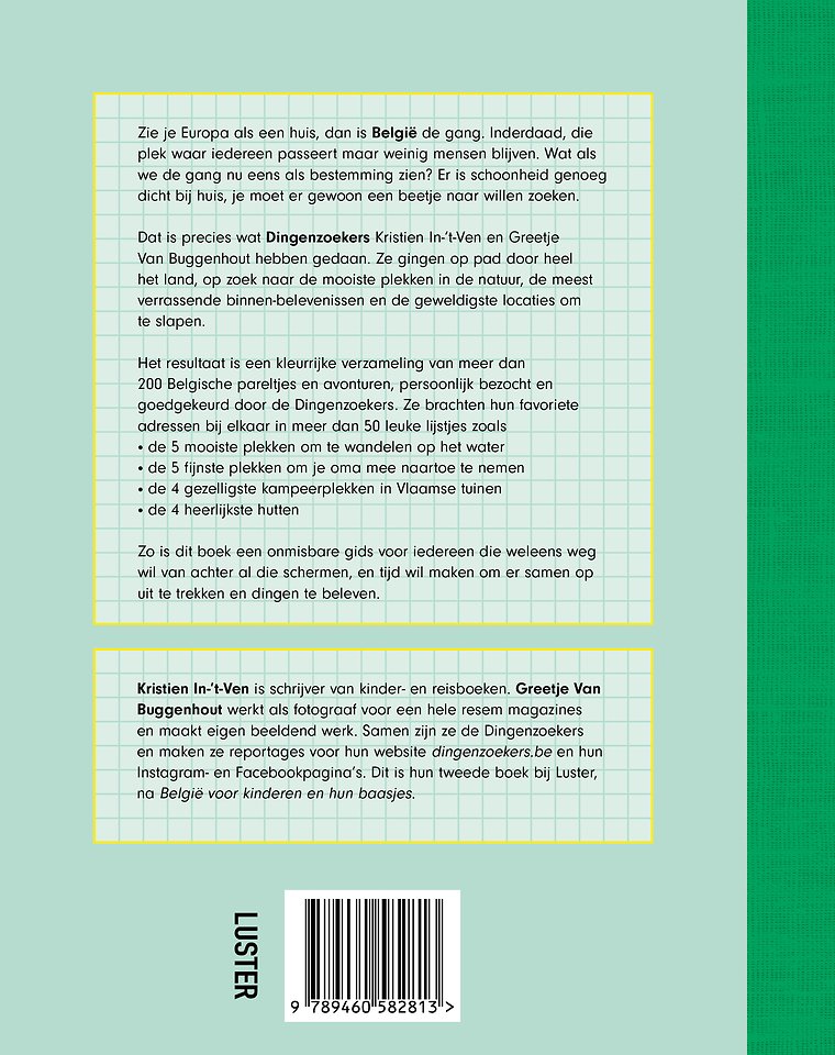De nadruk ligt op plekjes in de natuur en op het platteland, al worden ook de leukste steden niet vergeten. De meeste adressen zijn super voor families met kinderen, maar ook zonder een meute absoluut de moeite waard. Alle geselecteerde plekken werden persoonlijk bezocht door de makers Kristien In-‘t-Ven en Greetje Van Buggenhout. Kristien schreef de teksten, Greetje zorgde voor de beelden.