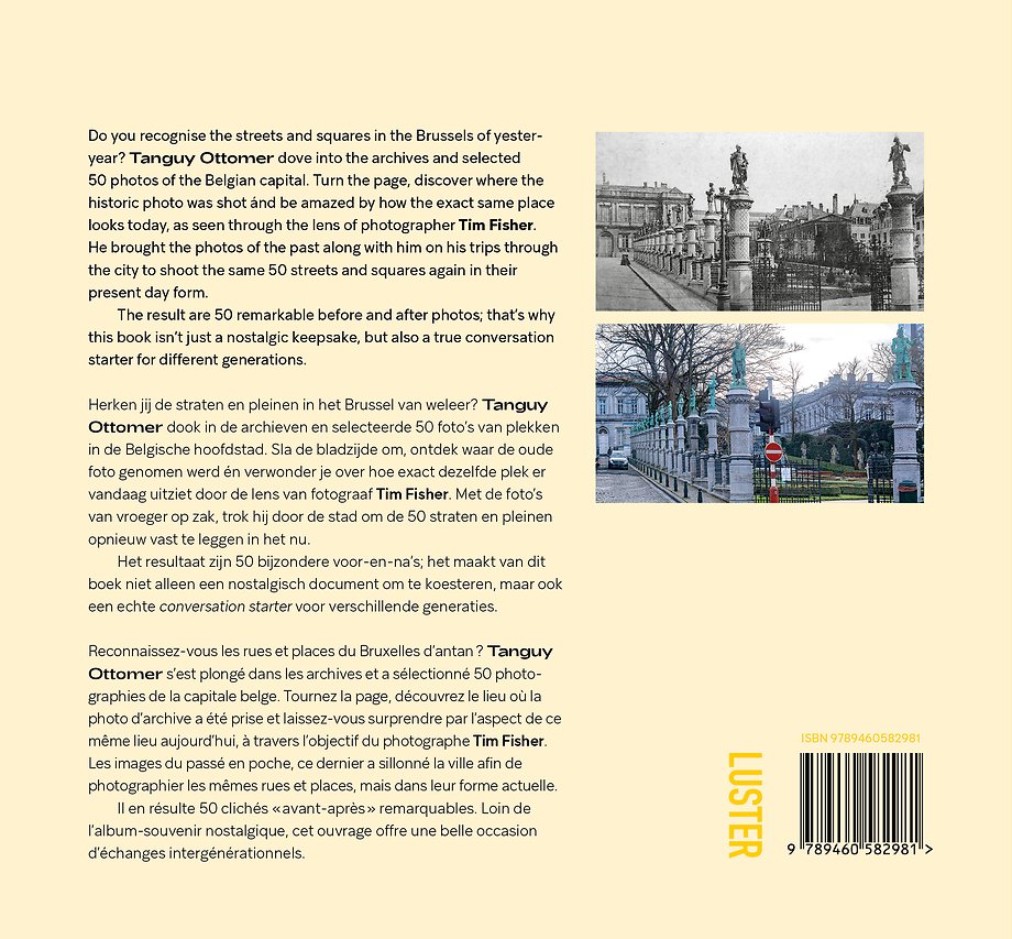 Herken jij de straten en pleinen in het Brussel van weleer? Tanguy Ottomer dook in de archieven en selecteerde 50 foto’s van plekken in de Belgische hoofdstad. Sla de bladzijde om, ontdek waar de oude foto genomen werd én verwonder je over hoe exact dezelfde plek er vandaag uitziet door de lens van fotograaf Tim Fisher. Met de foto’s van vroeger op zak, trok hij door de stad om de 50 straten en pleinen opnieuw vast te leggen in het nu.