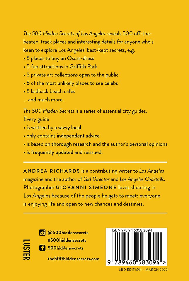 Los Angeles has so much to offer, and this guide helps you to choose where to start when discovering this beautiful city. Where are the best farmers’ markets? Which street foods are not to be missed? What are the liveliest places to go dancing? What are some unlikely places to spot celebrities? Which art galleries are worth a visit? In The 500 Hidden Secrets of Los Angeles, Andrea Richards shares 500 must-know addresses in one of the coolest cities in the United States. It is an affectionate guide to the City of Angels that avoids the touristy places and points out the urban details you are likely to miss. From the best outdoor concert venues to the most beautiful country escapes, this guide is the perfect companion visitors who want to make the most of their stay and residents who want to get to know their city even better.