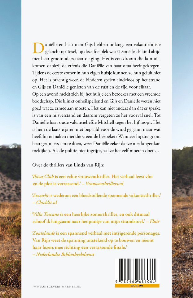 De grote droom van Gijs en Daniëlle komt uit: een eigen vakantiehuisje op Texel. Ze kunnen hun geluk niet op. Tot opeens een vreemde bezoeker voor de deur staat… Daniëlle en haar man Gijs hebben onlangs een vakantiehuisje gekocht op Texel, op dezelfde plek waar Daniëlle als kind altijd met haar grootouders naartoe ging. Het is een droom die kon uitkomen dankzij de erfenis die Daniëlle van haar oma heeft gekregen. Tijdens de eerste zomer in hun eigen huisje kunnen ze hun geluk niet op. Het is prachtig weer, de kinderen spelen eindeloos op het strand en Gijs en Daniëlle genieten van de rust en de tijd voor elkaar. Op een avond meldt zich bij het huisje een bezoeker met een vreemde boodschap. Die klinkt onheilspellend en Gijs en Daniëlle weten niet goed wat ze ermee aan moeten. Het kan niet anders dan dat er sprake is van een misverstand en daarom vergeten ze het voorval snel. Tot Daniëlle haar oude vakantieliefde Mitchell tegen het lijf loopt. Het is hem de laatste jaren niet bepaald voor de wind gegaan, maar wat heeft hij te maken met die vreemde bezoeker? Wanneer hij dreigt om haar gezin iets aan te doen, weet Daniëlle zeker dat ze niet langer kan toekijken. Als de politie niet ingrijpt, zal ze het zelf moeten doen…
