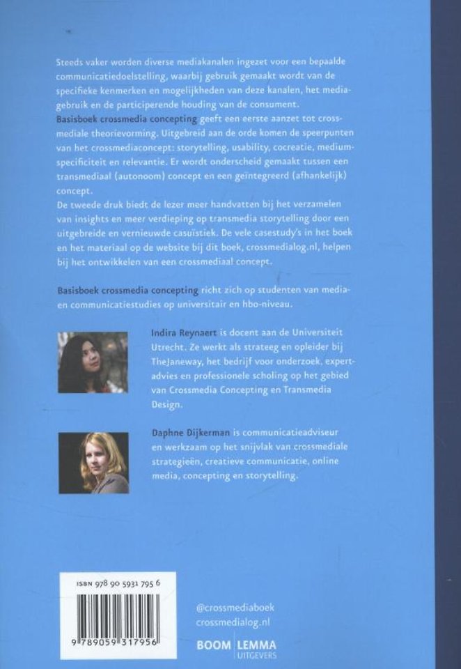 Steeds vaker worden diverse mediakanalen ingezet voor een bepaalde communicatiedoelstelling, waarbij gebruik gemaakt wordt van de specifieke kenmerken en mogelijkheden van deze kanalen en het mediagebruik en de participerende houding van de consument. 'Basisboek crossmedia concepting' geeft een eerste aanzet tot crossmediale theorievorming. Uitgebreid aan de orde komen de speerpunten van het crossmediaconcept: storytelling, usability, cocreatie, mediumspecificiteit en relevantie.