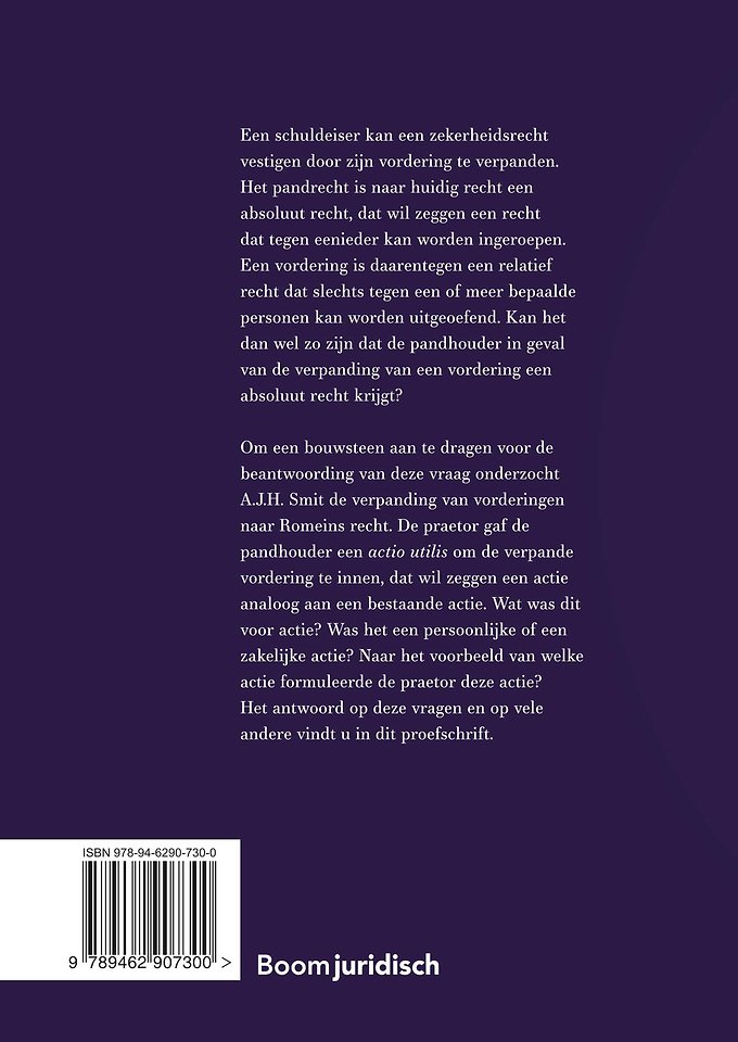 Om een bouwsteen aan te dragen voor de beantwoording van deze vraag onderzocht A.J.H. Smit de verpanding van vorderingen naar Romeins recht. De praetor gaf de pandhouder een actio utilis om de verpande vordering te innen, dat wil zeggen een actie analoog aan een bestaande actie. Wat was dit voor actie? Was het een persoonlijke of een zakelijke actie? Naar het voorbeeld van welke actie formuleerde de praetor deze actie? Het antwoord op deze vragen en op vele andere vindt u in dit proefschrift.