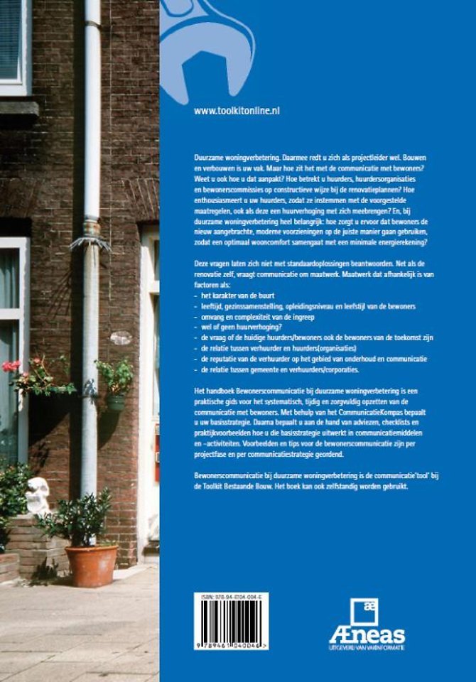 Het handboek Bewonerscommunicatie bij duurzame woningverbetering is een praktische gids voor het systematisch, tijdig en zorgvuldig opzetten van de communicatie met bewoners. Met behulp van het CommunicatieKompas bepaalt u uw basisstrategie. Daarna bepaalt u aan de hand van adviezen, checklists en praktijkvoorbeelden hoe u die basisstrategie uitwerkt in communicatiemiddelen en -activiteiten. Voorbeelden en tips voor de bewonerscommunicatie zijn per projectfase en per communicatiestrategie geordend. Bewonerscommunicatie bij duurzame woningverbetering is de communicatie'tool' bij de Toolkit Bestaande Bouw. Het boek kan ook zelfstandig worden gebruikt.