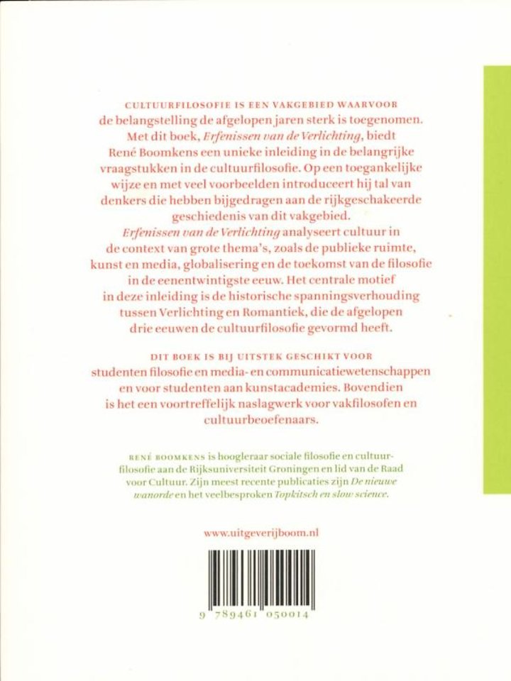 Cultuurfilosofie is een vakgebied waarvoor de belangstelling de afgelopen jaren sterk is toegenomen. Met dit boek, 'Erfenissen van de Verlichting', biedt René Boomkens een unieke inleiding in de belangrijke vraagstukken in de cultuurfilosofie. Op een toegankelijke wijze en met veel voorbeelden introduceert hij tal van denkers die hebben bijgedragen aan de rijkgeschakeerde geschiedenis van dit vakgebied.