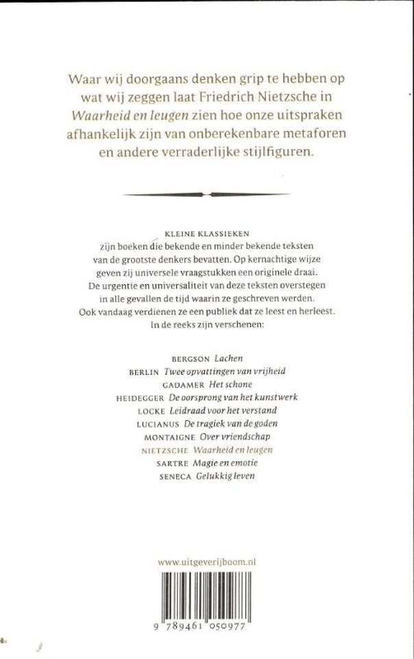 Waarheid en leugen bevat een selectie teksten uit het vroege werk van Nietzsche. Waar wij doorgaans denken grip te hebben op wat wij zeggen, laat deze beroemde filosoof zien hoe onze uitspraken afhankelijk zijn van onberekenbare metaforen en andere stijlfiguren.