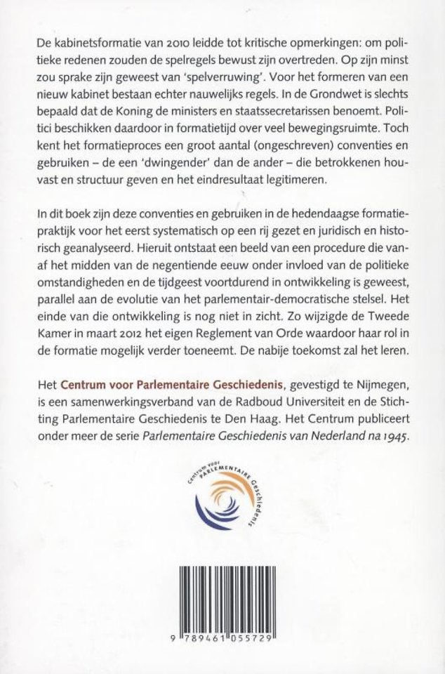 In dit boek zijn deze conventies en gebruiken in de huidige formatiepraktijk voor het eerst systematisch op een rij gezet en juridisch en historisch geanalyseerd. Hieruit ontstaat een beeld van een procedure die vanaf het midden van de negentiende eeuw onder invloed van de politieke omstandigheden en de tijdgeest voortdurend in ontwikkeling is geweest, parallel aan de evolutie van het parlementair-democratische stelsel. Het einde van die ontwikkeling is nog niet in zicht. Zo wijzigde de Tweede Kamer in maart 2012 het Reglement van Orde waardoor haar rol in de formatie mogelijk aanzienlijk toeneemt. De nabije toekomst zal het leren.