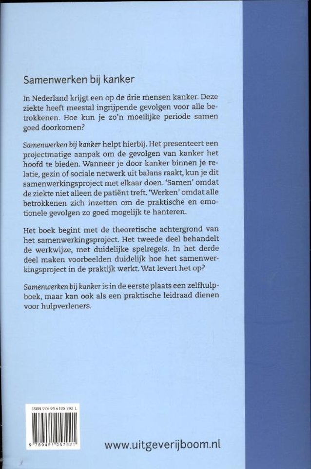 Samenwerken bij kanker helpt hierbij. Het presenteert een projectmatige aanpak om de gevolgen van kanker het hoofd te bieden: mensen die ten gevolge van kanker binnen hun relatie of gezin uit balans raken kunnen met elkaar dit samenwerkingsproject doen. 'Samen' omdat de ziekte niet alleen de patiënt treft, maar ook zijn omgeving. 'Werken' omdat de patiënt en zijn naasten zich in groepsverband inzetten om de praktische en emotionele gevolgen zo goed mogelijk te hanteren. Voorbeelden maken duidelijk hoe zo'n project in de praktijk werkt. Wat levert het op? Hoe kan het de betrokkenen houvast geven?