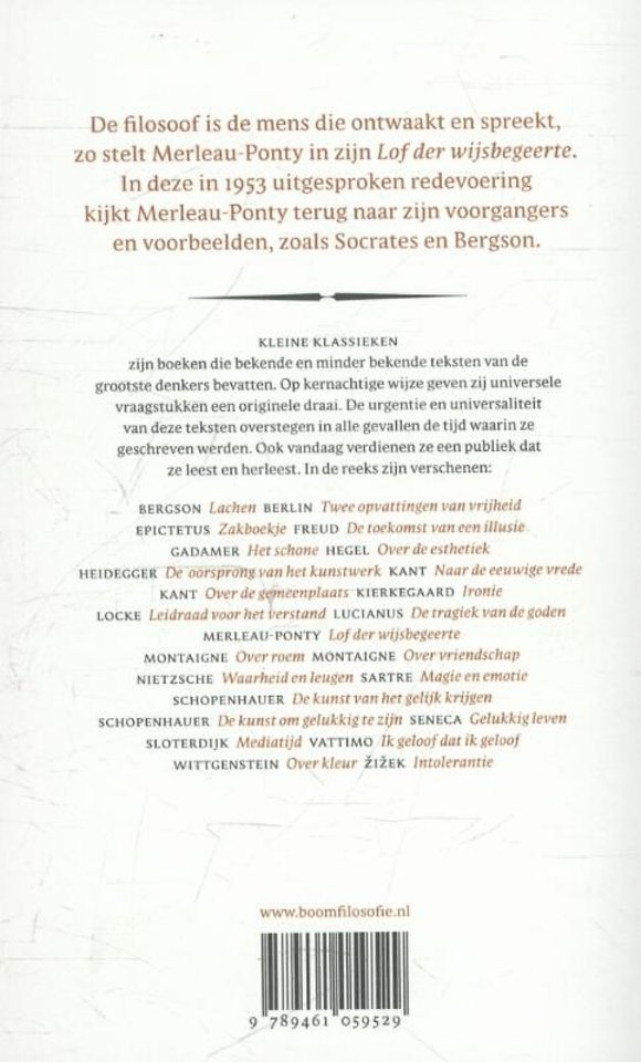 uitgesproken redevoering kijkt Merleau-Ponty terug naar zijn voorgangers en voorbeelden. Naar Socrates bijvoorbeeld, die stelt dat zijn wijsheid berust op het feit dat hij weet dat hij niets weet, maar ook naar Bergson. Lof der wijsbegeerte is een uitstekende en unieke inleiding op het nog steeds veelbesproken oeuvre van deze filosoof.