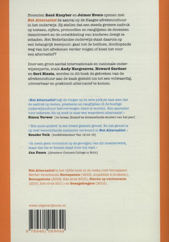 Docenten René Kneyber en Jelmer Evers openen met ‘Het alternatief’ de aanval op de Haagse afrekencultuur in het onderwijs. Zij stellen dat een steeds grotere nadruk op cijfers, protocollen en ranglijsten de docenten demotiveert en de ontwikkeling van kinderen dreigt te schaden.