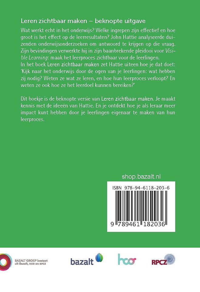 Meer over John HattieMaak kennis met de visie van onderwijswetenschapper John Hattie. In deze beknopte uitgave van Leren zichtbaar maken vindt u zijn belangrijkste ideeën terug. Hatties centrale boodschap luidt: weet welke impact u heeft op het leren van uw leerlingen. Kijk naar uw onderwijs door de ogen van uw leerlingen en leer hen hun eigen leraar te worden.