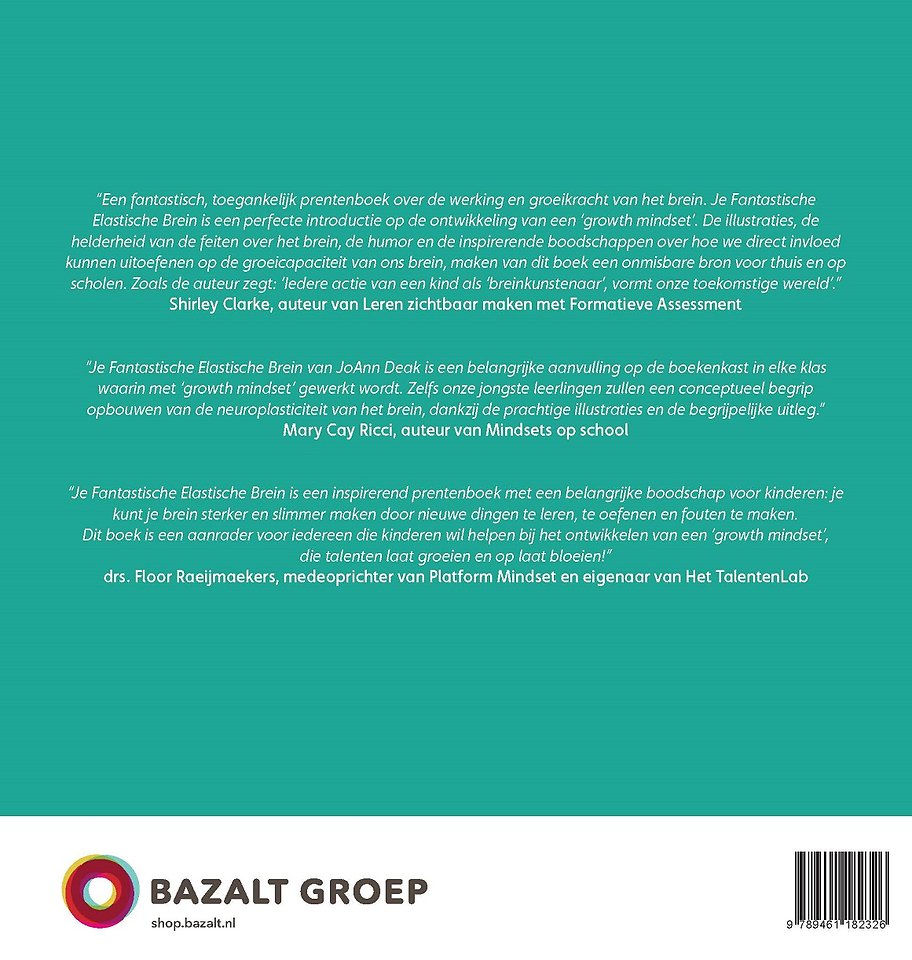 "Je Fantastische Elastische Brein van JoAnn Deak is een belangrijke aanvulling op de boekenkast in elke klas waarin met 'growth mindset' gewerkt wordt. Zelfs onze jongste leerlingen zullen een conceptueel begrip opbouwen van de neuroplasticiteit van het brein, dankzij de prachtige illustraties en de begrijpelijke uitleg." - Mary Cay Ricci, auteur van Mindsets op school