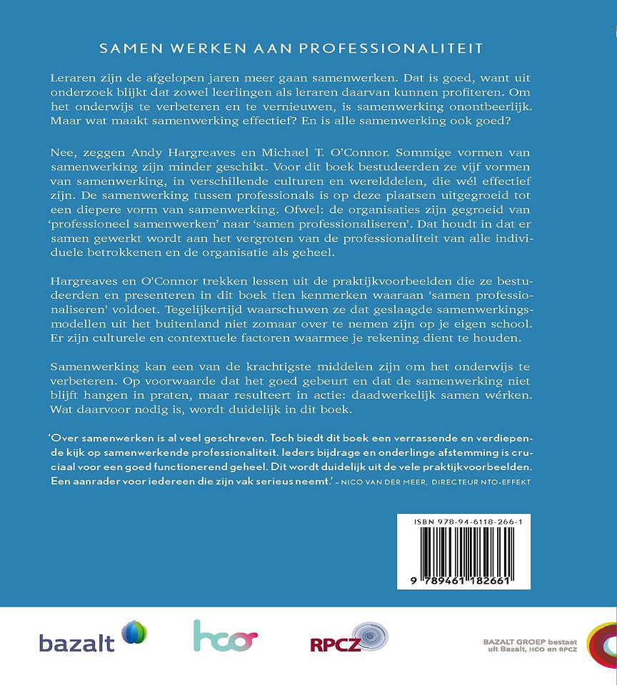 Nee, zeggen Andy Hargreaves en Michael T. O’Connor. Sommige vormen van samenwerking zijn minder geschikt. Voor dit boek bestudeerden ze vijf vormen van samenwerking, in verschillende culturen en werelddelen, die wél effectief zijn. De samenwerking tussen professionals is op deze plaatsen uitgegroeid tot een diepere vorm van samenwerking. Ofwel: de organisaties zijn gegroeid van ‘professioneel samenwerken’ naar ‘samen professionaliseren’. Dat houdt in dat er samen gewerkt wordt aan het vergroten van de professionaliteit van alle individuele betrokkenen en de organisatie als geheel.