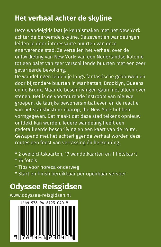 Deze wandelgids laat je kennismaken met het New York achter de beroemde skyline. De zeventien wandelingen leiden je door interessante buurten van deze enerverende stad. Ze vertellen het verhaal over de ontwikkeling van New York: van een Nederlandse kolonie tot een palet van zeer verschillende buurten met een zeer gevarieerde bevolking.