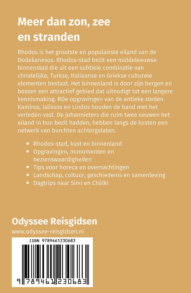 De Odyssee Reisgids Rhodos neemt je mee naar het bekende en onbekende Rhodos. Rhodos-stad bezit een middeleeuwse binnenstad die uit een subtiele combinatie van christelijke, Turkse, Italiaanse en Griekse culturele elementen bestaat. De opgravingen van de antieke steden Kamíros, Ialíssos en Líndos houden de band met het verleden vast. De johannieters die ruim twee eeuwen het eiland in hun bezit hadden, hebben langs de kusten een netwerk van burchten achtergelaten.